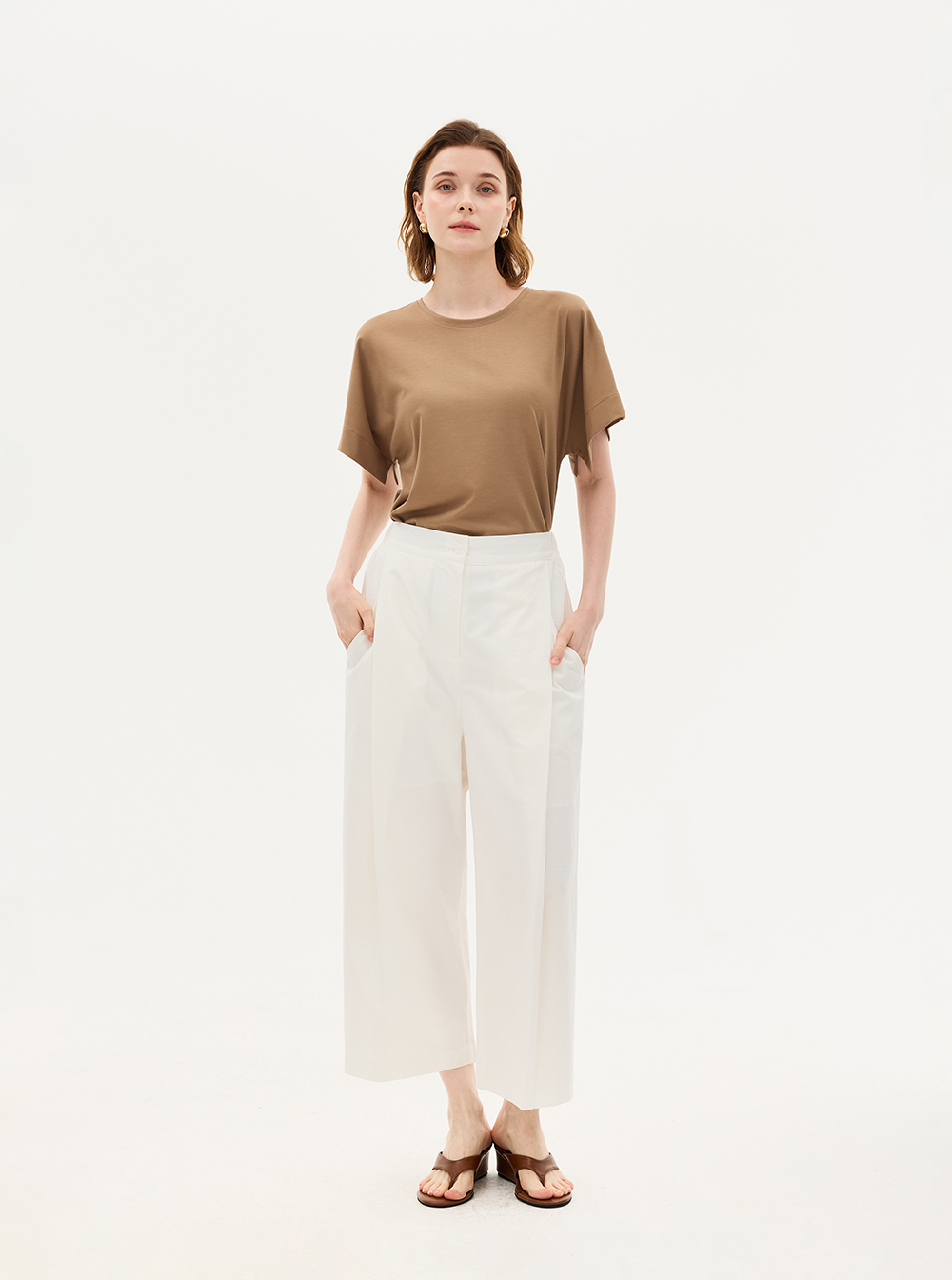 허리 바깥쪽에 원 턱 디테일이 더해져 입체적인 실루엣을 완성하며,
